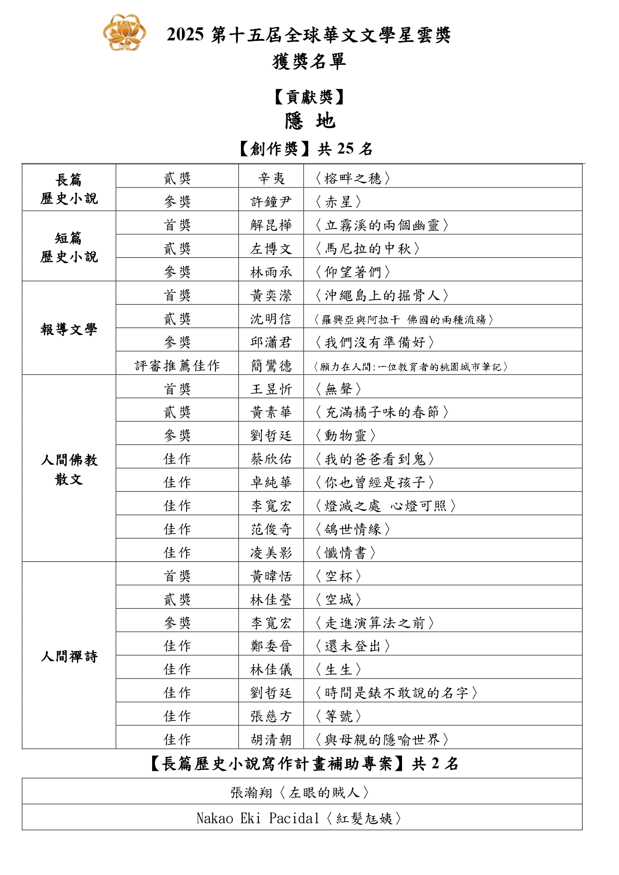 HOT:公告【文學獎】2025第十五屆全球華文文學星雲獎揭曉 記者曾博群 2025-10-14