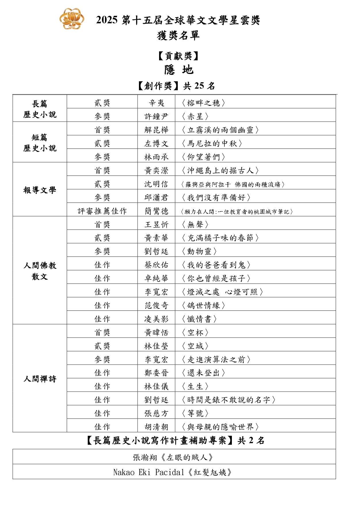 HOT:公告【文學獎】2025第十五屆全球華文文學星雲獎揭曉 記者曾博群 2025-10-14